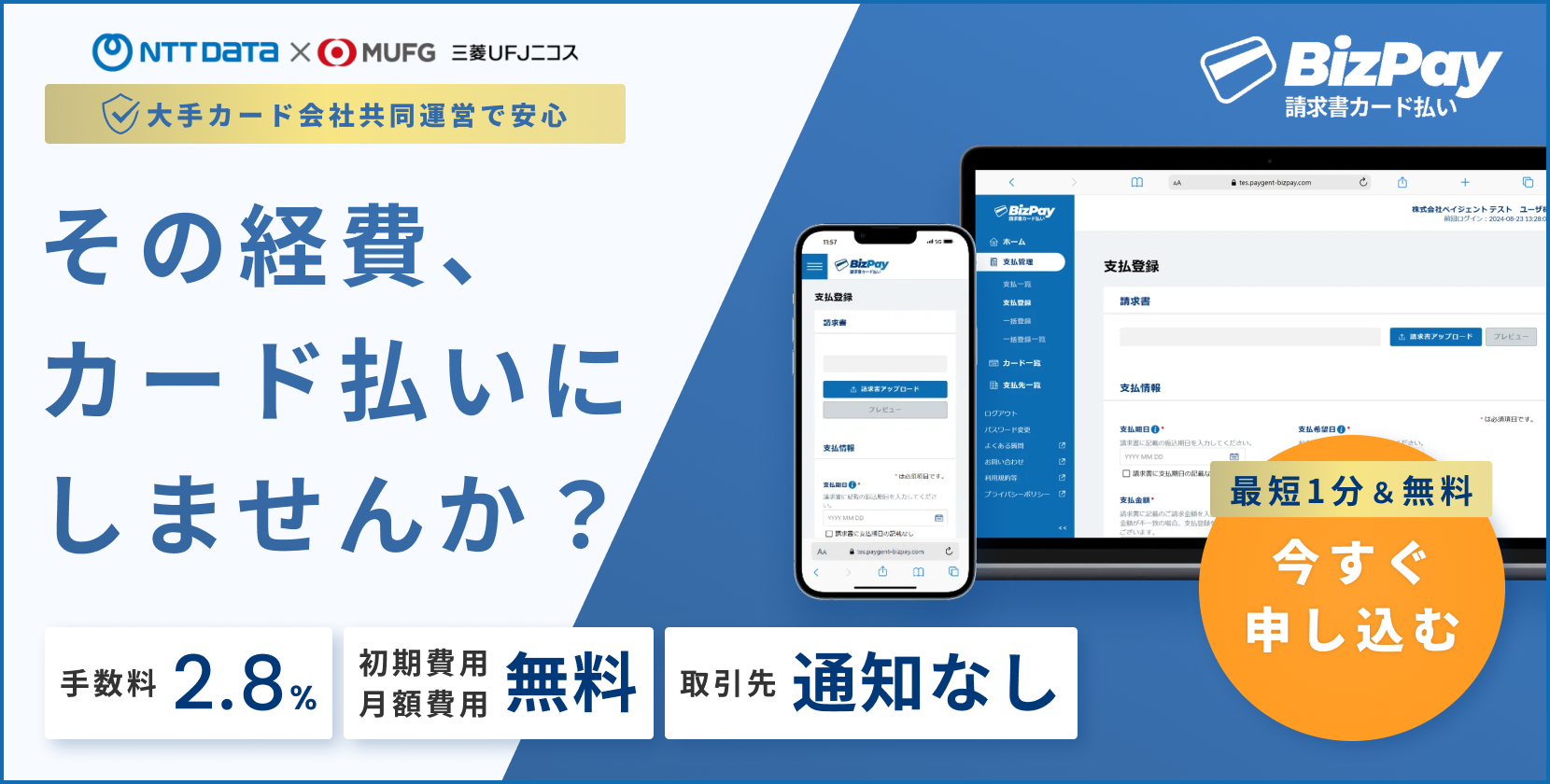 『Bizpay請求書カード払い』の登録はWeb上で完結します。面談や書類の提出は不要です。「お試しで利用したい」という場合も可能です。